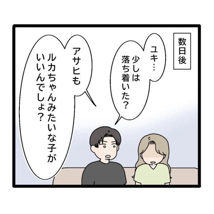数日後、自宅にやって来たアサヒさんに、「ルカちゃんみたいな子がいいんでしょ?」と言い出すユキさん。ユキさんは、アサヒさんは仕方なく自分と結婚したと思っていると知り、思いをきちんと伝えるアサヒさん。やっと素直になれたユキさんと、子どもたちが早く仲直りして家族楽しく過ごせますように。