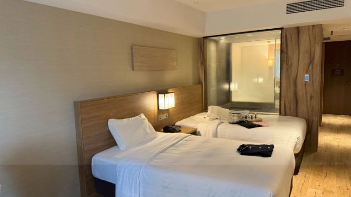 今回は温泉付きのプレミアルームに泊まったのですが、実はこの部屋こそが「Hakuba Sleep Reset Journey for Kids」プランに欠かせない重要なポイント。温泉に加え、部屋に入れば睡眠をサポートする3つのブランドアイテムを体験できる特別仕様の“スリープルーム”になっていました。部屋に入るなり、「おお!」と感嘆する我々親子(笑)。とっても心地のよい素敵な空間に迎えられ、これから始まることへの期待で胸がいっぱいです!