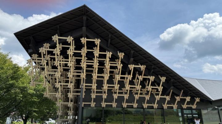 建築家・隈研吾氏が設計した、国内最大級のスノーピーク直営店がメインとなっている複合施設。アウトドア派ならとっても気になるスポットです。エントランスから中に一歩足を踏み入れると、大きな窓の向こうに見えるのは雄大な山々、素晴らしい風景が視界に飛び込んできました!こちらの建物、天然素材を生かした内観も見ごたえあるですが、外観の木組みがとにかく圧巻!雪の結晶を思わせる繊細なデザインで、周りの景色と見事に調和していました。