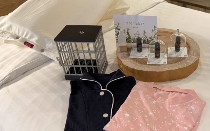 客室温泉付きのお部屋、スリープルームに設置されているのは、ブレインスリープの『ブレインスリープ ピロー』(大人用・子ども用)。ワコールの『ワコール 睡眠科学KIDSパジャマ』アットアロマの『アロマバー(アロマオイル)』。そして、スマホ収納BOXです。どれもこれも、子どもの眠りを全力でサポートしてくれるそんな贅沢なアイテムの数々ですが、大人にとっても疲れた体を休めるのに最高のアイテムがそろっていました!