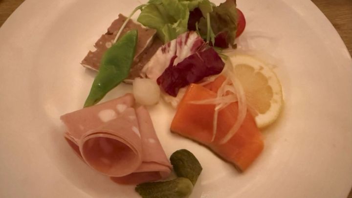 前菜の盛り合わせには、スモークサーモン、モルタデラハム、パテ・ド・カンパーニュが地元野菜とともに登場。ゆっくり味わうディナーは、日頃バタバタしがちな親子にとって、まさに必要なひとときだと感じました。