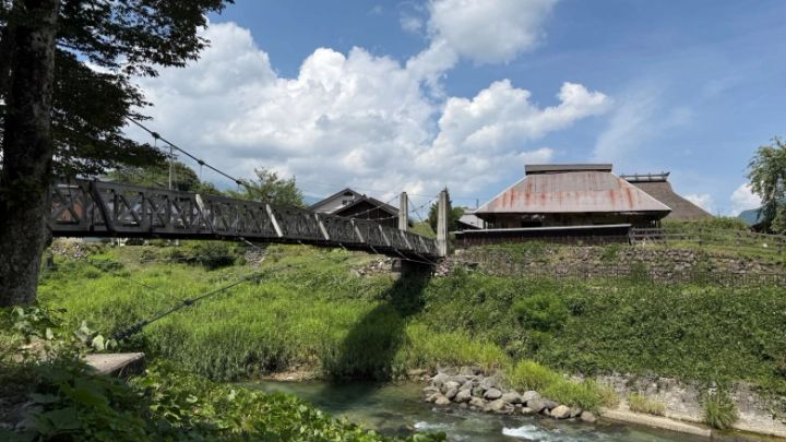 誰もが遠く懐かしい気持ちを思い起こしそうな、素朴な田園風景が広がる大出公園。この場所は、まさに「日本の原風景」ともいえる豊かな空間です。公園のシンボルは、雄大な白馬三山を背景に流れる姫川と、そこにかかる「大出吊橋」。ここから望める風景は白馬村を代表する絶景としても有名な場所です。