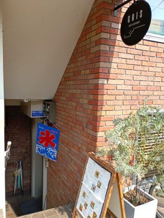 少し緊張しながら、階段を下りて行きます。 メニューの看板と、この時期には「氷」の文字も見えでいます(かき氷?)