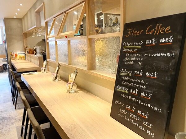 入り口からつながる、カウンターには6席が並びます。 本日の珈琲のメニューが、丁寧に黒板に書かれています。