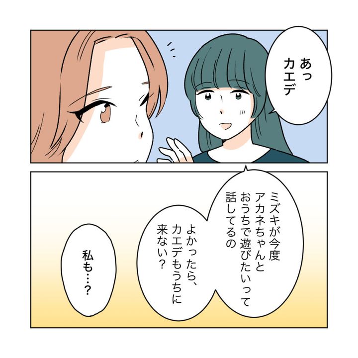 私はカエデが帰る前に「ミズキが今度アカネちゃんとお家で遊びたいって話してるの。よかったら、カエデもうちに来ない?」と声をかけました。「私も・・・?」と少し驚いたようなカエデです。