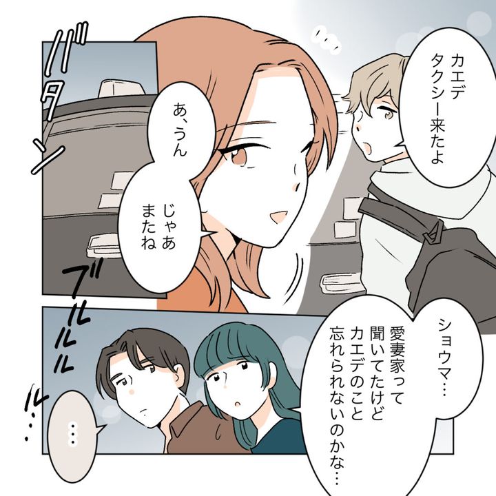 カエデは「タクシーきたよ」とショウマに呼ばれ、一緒にタクシーに乗って帰っていきました。「ショウマ・・・愛妻家って聞いてたけど、カエデのこと忘れられないのかな・・・」という私のつぶやきにワタルは何も言いませんでしたが、私と同じように、ショウマとカエデが乗ったタクシーを見送っていました。