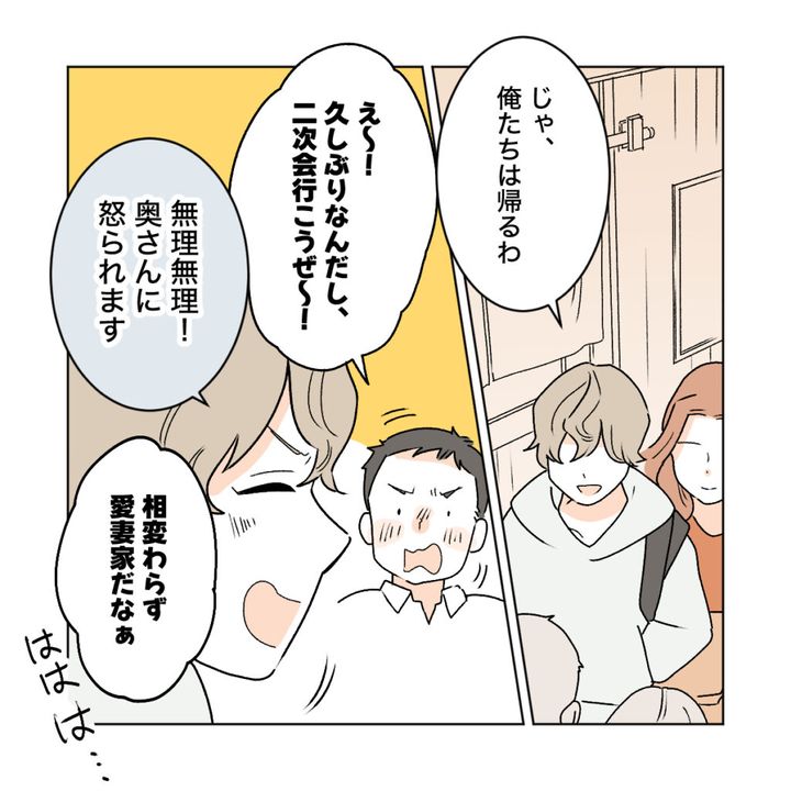 「じゃ、俺たちは帰るわ」とショウマがカエデと一緒にお店を後にしようとした時、同級生の一人が「えー!久しぶりなんだし、二次会行こうぜ~!」と誘いましたがショウマは「無理無理!奥さんに怒られます」とキッパリ。「相変わらず愛妻家だなぁ」と笑われていました。