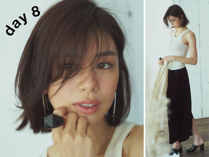 緩く巻いたニュアンスヘアは、肌見せコーデや印象的なピアスとも好相性で、表情も一気に華やぐ。day 6と同じように黒目の延長線上で髪を分け、32㎜のヘアアイロンで巻いていく。前髪とサイドを内巻きにし、軽くかき上げるようにすると自然とカーブを描くシルエットに。ライトなヘアミルクをなじませてから片方だけ耳掛けにすると、メリハリのあるスタイルが完成。