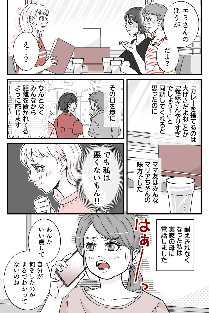 「カレーを捨てるのは大げさだよね」とか「義妹さんやりすぎでしょう!」って同調してくれると思ったのに、ママ友はみんなマリアちゃんの味方でした。そしてその日を境に、なんとなくみんなから距離を置かれているように感じます。遊びの誘いも来なくなりました。耐えきれなくなった私は、実家の母(60代)に電話しました。