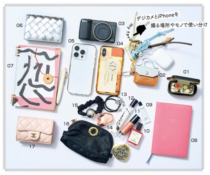 01仕事柄ジュエリーを持ち歩くことが多いので専用ケースにIN。02エジューのAirPodsケースはチャームをたっぷりつけて今っぽく♡ 03リコーのデジカメはフレームをカスタマイズ。インスタ投稿用に。04iPhoneXSはカメラの質感が好きで写真専用として愛用。シーンや場所によって、デジカメと使い分け。05普段愛用しているiPhoneと2台持ち。06ボッテガ・ヴェネタの財布は運気がアップしそうなシルバーを。07デザイン考案ノート。08スケジュールは手帳派。09モス オリジンのハンドクリーム。10ネイルに見えるけど実はリップ。11パーム オブ フェロニアのアロマオイル。12香り系アイテムはたくさん持ち歩き、1日のうちに何度も香りを変えるのが好き。13ヘイップのヘアゴム。14ストーンのモチーフが可愛いアーレスの練り香水。15シュシュ。16セリーヌのポーチが収納力たっぷり。17ミニバッグにチェンジしてもすっぽりおさまるシャネルの財布。