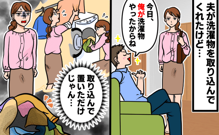 でも、その日は私が朝に洗濯機を回して、干してから出かけた日。夫がやったのは、夕方になって取り込んで部屋に置いただけでした。