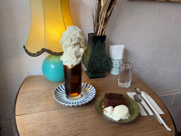 コーヒーフロート1,200円と米粉と豆腐のココアブラウニー770円を。アイスがもりもり過ぎて!!!(フロートに目がいきがちですがケーキにもアイスが添えられてます)