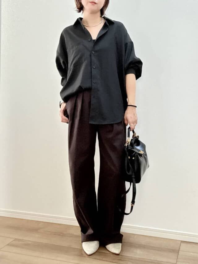 黒シャツ×ブラウンでトレンドの“秋配色”に
