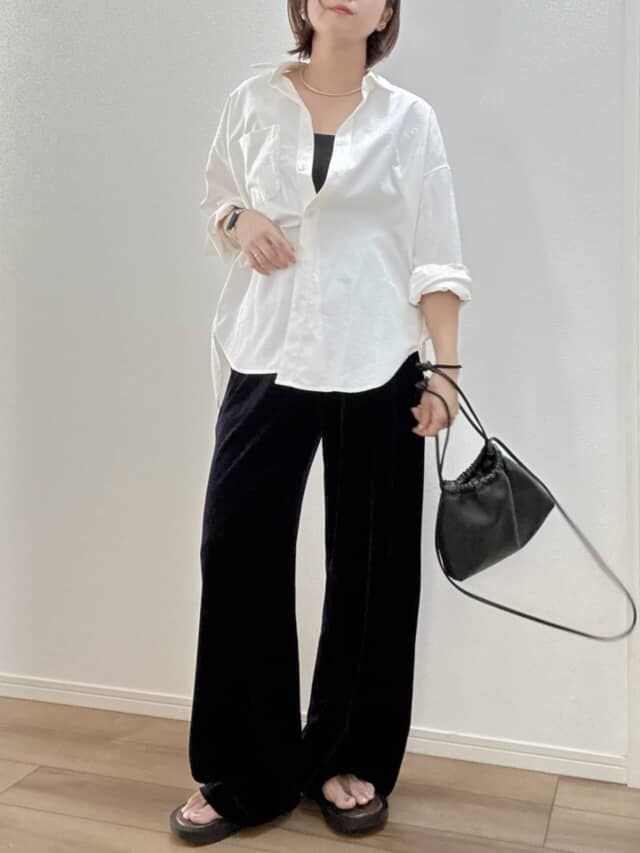 大きめのシャツですが、落ち感のある素材なので体型を拾わずすっきり見え。前ボタンをすべて閉じずに数カ所だけ留め、抜け感を意識すると小顔効果もアップ。まだ暑い時期でも白の軽やかさとベロアの秋らしさを両立でき、デイリーコーデの鮮度が一気に上がります。