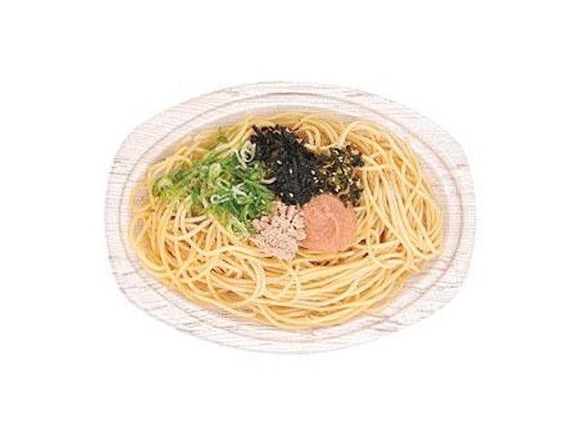 昆布とかつお節、さば節の出汁がきいたソースを使用した明太子スパゲティです。たらことボイルたらこ、刻みのり、青ねぎ、白ごま、高菜をトッピングしました。
