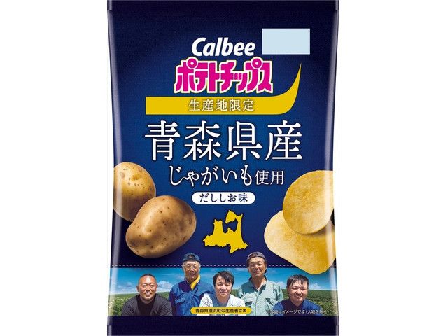 ●『青森県産じゃがいも使用ポテトチップス だししお味』は、昆布だしをきかせたしお味がじゃがいものおいしさを一層引き立てます。 ●パッケージには、青森県横浜町のじゃがいも生産者の方々の写真を掲載。「青森県産じゃがいも」の文字や青森県のシルエットを掲載することで、青森県のものにこだわってつくった商品であることを強調しました。