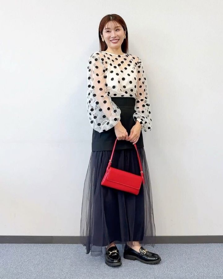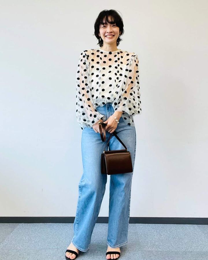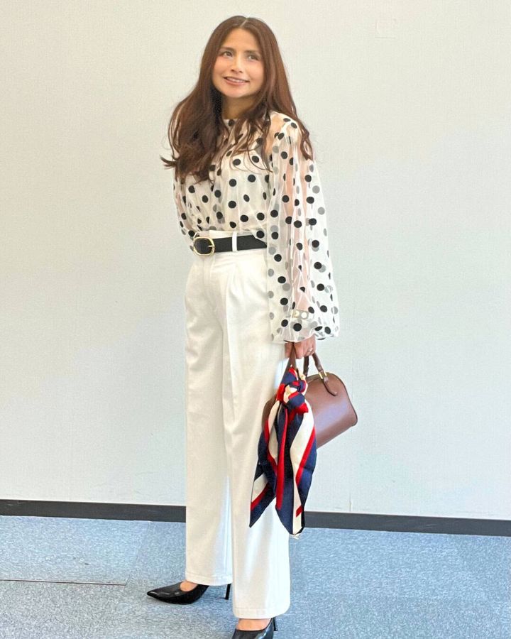 甘くないモードなドットブラウス。キャミがブラウスに縫い付けられているので、動いても紐がズレることもなく快適!長袖でもシアー素材なので涼しく、夏〜秋への移行コーデにピッタリです♪