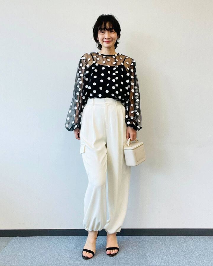 ポルカドットのシアーブラウスと無地のキャミソールのインナーがセットに。ふんわりシルエットとドット柄が洗練されたモードを演出します。デニムやハーフパンツなどカジュアルボトムスを合わせれば甘ニッシュコーデが完成。