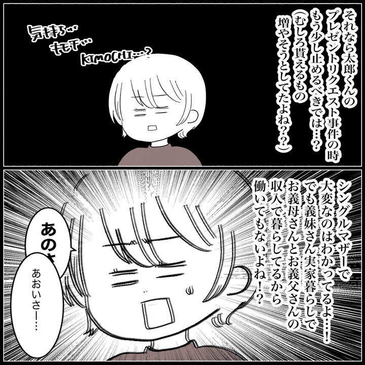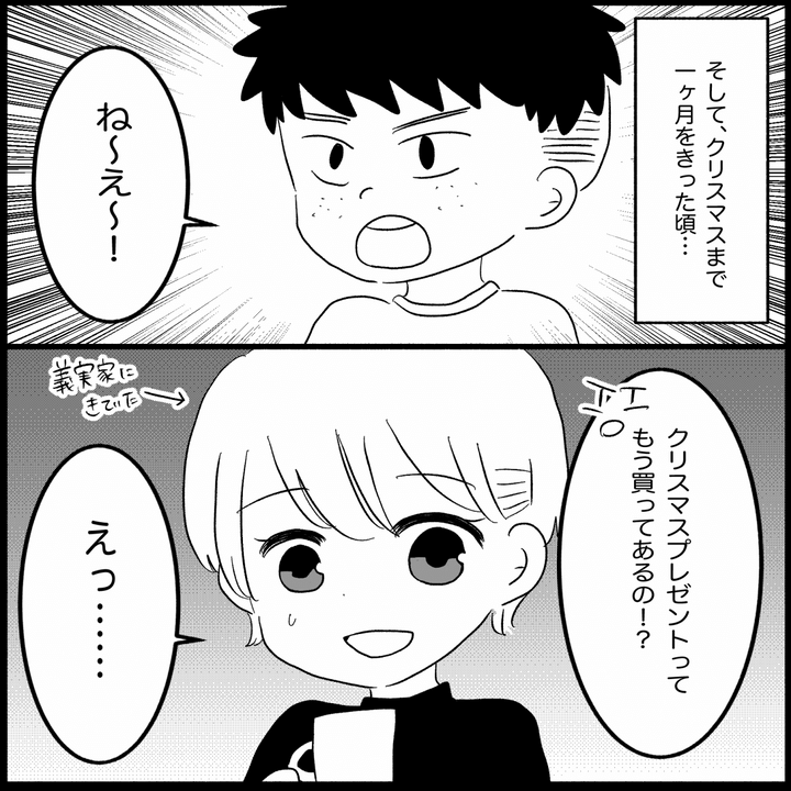 義妹親子や義両親の態度に悩まされていた、あおいさん。そんなある日、義実家を訪ねると、太郎くんはヒロさんにクリスマスプレゼントを2つ頼みました。