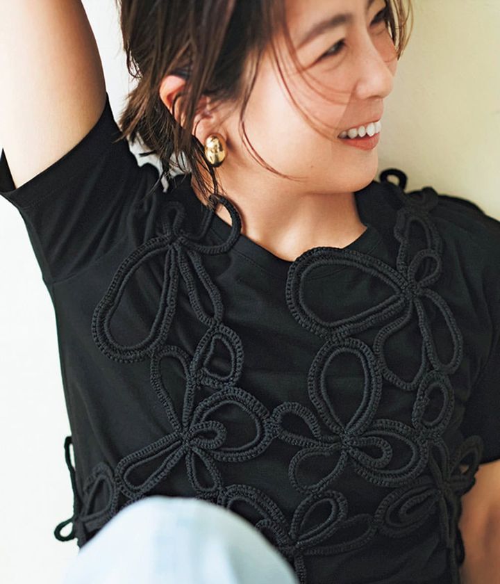 いつもの黒T×デニムもフラワーモチーフのかぎ針編みベストで一気にモード見え。黒レイヤードで気負わないオシャレを満喫。