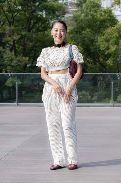 「小物でカラーを足して、バランスを意識しました。かぎ針編みのセットアップは、この季節ならではの素材感が楽しめてお気に入り。秋冬は中にタートルを合わせても着たいと思っています」