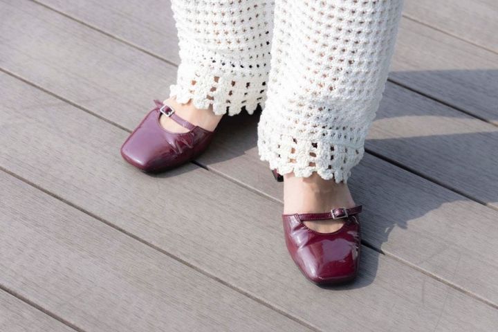 エナメル調のツヤが映えるボルドーカラーのパンプス。クラシカルなストラップデザインが上品さを引き立て、編み模様から覗く足もとに華やぎを添えます。
