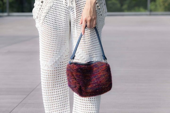 マーブル模様が上品なニットバッグは、あたたかみがありながら配色の美しさがスタイリングのアクセントに。小ぶりながら存在感もあり、シンプルな装いに映えます。