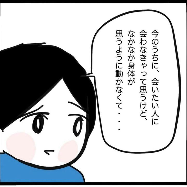 遠くにいる友人、家族、親戚、恩人…「またいつか会いに行こう」と思っているうちに、自分にも相手にも、残された時間は少なくなっているのに、元気なうちにはそのことに気づきにくいですよね。自分が少しでも動けるうちに、考えていられるうちに、少しでもその希望が叶う努力はしておいた方が良いのでしょうね。