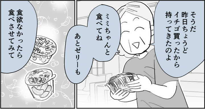 義母がお土産を持ってきてくれていたのですが、その中にはミミが好きなイチゴもありました。今まで義母ことを迷惑な存在だと思っていたし、疎遠にしたいとまで思っていました。でも義母は、いつも私たちのことを気にかけてくれていた……そんな義母の想いを私は初めて知ったのです。