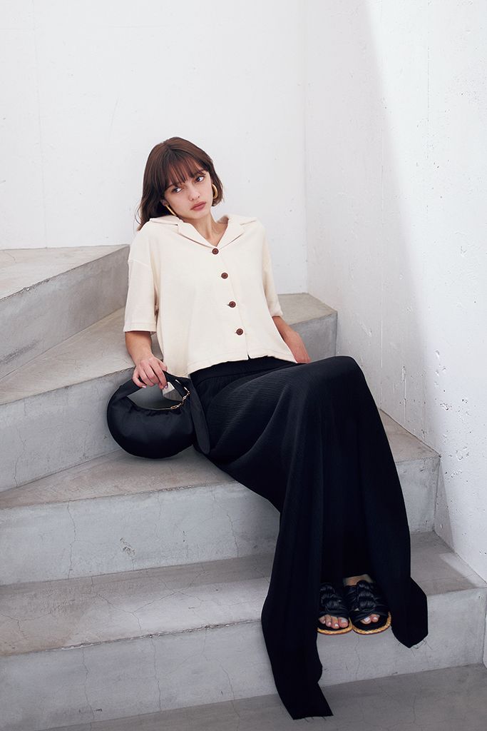 ハンサムからエフォートレスに変える起毛&開襟のリラックス感。ニットともまた違うソフトな風合いにより、モノトーンスタイルも穏やかに。 白パイルオープンカラーシャツ/THE SHINZONE 黒スカート/コキュカ
