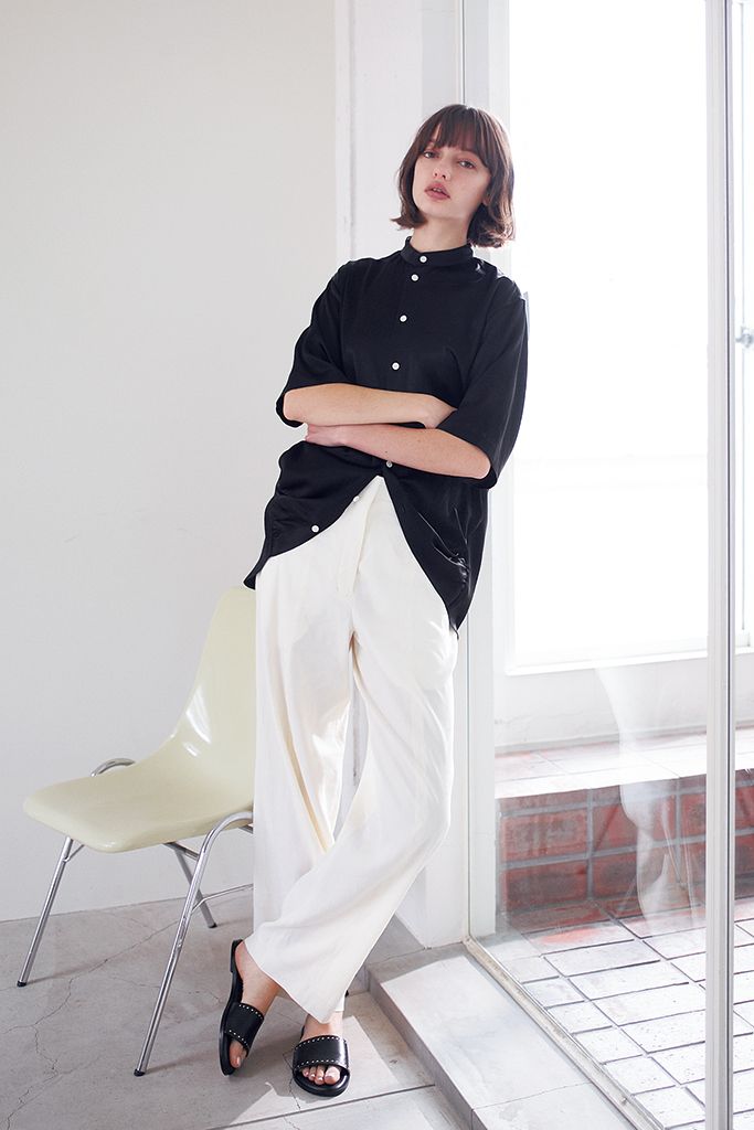 えりの主張をなくしてそでも短く。よりTシャツライクな形で黒サテンを気軽に。サテンのドレープを強調できる、カーブを描くすそデザイン。フロントが短くてタックINしなくてもボトムとのバランスがとりやすいから、スタイルアップまで無理なくかなう。 黒サテンシャツ/チノ(モールド) オフホワイトストレートパンツ/COS