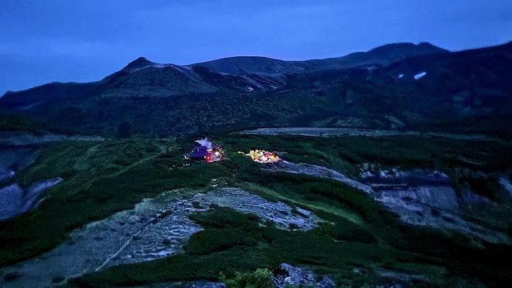 暗い山の中に光るテント達
