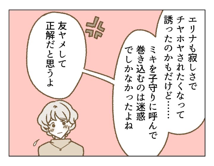 ミキさん(36歳)は、都内在住で年長の女の子を育てるワーママ。仕事や家事や子育てに追われる毎日を退屈に感じていました。そんな中、大学時代の友人・エリナさんから突然再会のお誘いが。学生時代に同じゼミだったシンジさんとケントさんを交え、子連れ飲み会となりました。しかし都合のいい子守り要員として呼ばれたことに気づいたミキさんは、ブチ切れて絶縁。その数か月後、なんとエリナさんがシンジさんとケントさんと二股不倫、それがバレて離婚したと友人から聞いたのです。