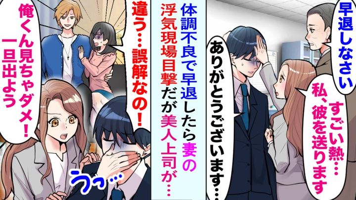 連日続いた繁忙期。体調が思わしくなかった僕は、上司のすすめもあり早退することに。妻とはなぜか連絡が取れないままだったので、女性の上司が自宅まで車で送ってくれました。