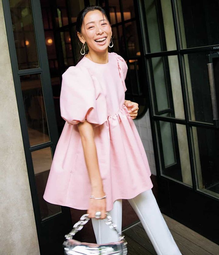 試着室の鏡に映る自分の姿にがく然…。思ったよりおデブだったショックを抱えて挑む同窓会。〝細見え〟より〝幸せ見え〟を目指して増量ボディもポジティブに変換。気になるお腹も二の腕もまあるく包むピンクのペプラムブラウスで多幸感たっぷりに♡ シルバー小物がトレンド感とキレをプラス。