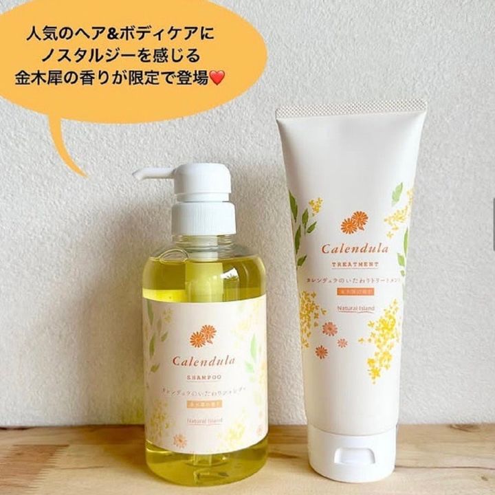そんな金木犀の香りに包まれる「Natural Island(ナチュラルアイランド)」で人気の「カレンデュラのいたわりシリーズ」から、スペシャルなヘアケア2品が数量限定で登場します。Natural Island専属のフレグランスデザイナーが金木犀に果実を重ね、風にのってふわっと香る心ときめく幸せな瞬間をイメージし調香。どこか懐かしい、甘く奥深いあの香りを思う存分楽しめます。
