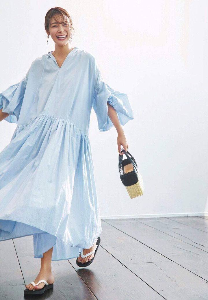 風でふわっと膨らむ、肌離れの良いリラクシーなワンピース。ボリューム袖の甘ディテールが、体力的に消耗する日でも高揚感を与えてくれる。清涼感のある爽やかなブルーで、視覚からも涼しさを。