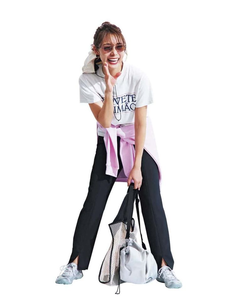 パンツ¥7,990(アンフィーロ〈オンワード樫山〉)Tシャツ¥11,000(ザ シンゾーン/シンゾーン ルミネ有楽町店)腰に巻いたスウェット¥4,048(ユナイテッド アスレ/キャブ)バッグ¥6,050(ラ・ユット/グーニーPR)メッシュバッグ¥7,150ハット¥8,910(ともにスピード/ゴールドウイン カスタマーサービス)スニーカー¥16,500(ニューバランス/ニューバランスジャパンお客様相談室)リング¥18,700(ニナ・エ・ジュール/ショールーム ロイト)サングラス¥50,600(アイヴァン/アイヴァン 東京ギャラリー)