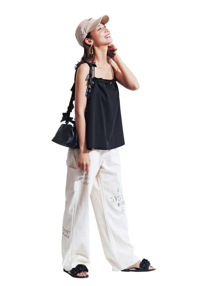 べアトップ¥16,940(メゾンスペシャル/メゾンスペシャル 青山店)パンツ¥21,780(ペイデイ/グーニーPR)バッグ¥13,200(ツル バイ マリコ オイカワ)シューズ¥12,100(メリッサ/メリッサ シューズ ジャパン)キャップ¥14,300(オペラスポーツ/サードマガジン)ピアス¥29,700(リューク)