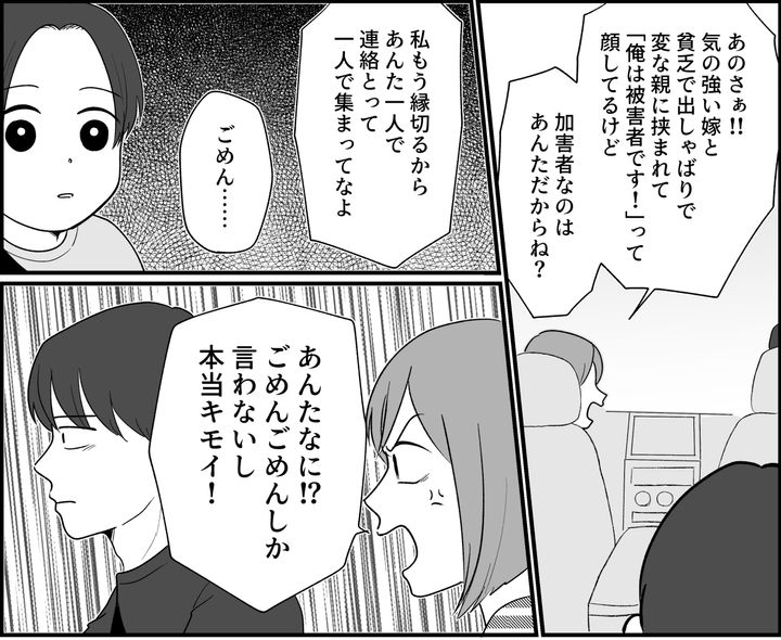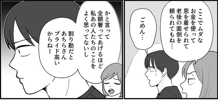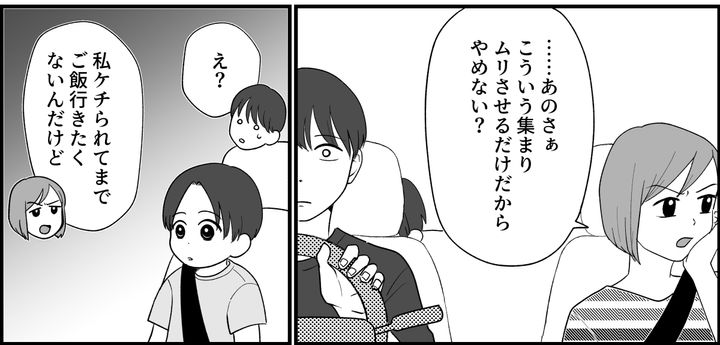 義両親との食事会の帰りの車中で、私は旦那に今日のイライラをぶつけました。「……あのさぁこういう集まりムリさせるだけだからやめない? 私、ケチられてまでご飯行きたくないんだけど。ここでムダなお金を使って恩を着せられて、老後の面倒を頼られてもね……」旦那は黙って私の話を聞いています。