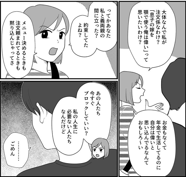 私がなにを言っても「ごめん……」としか言わない旦那に本当に頭にきました。食事会をするなら義両親と私の間に立ってほしいと事前に頼んでいたにも関わらずなんにも機能しなかったことも、注文係をさせられたことも……今日は、私にとってムダでしかない時間だったのです。