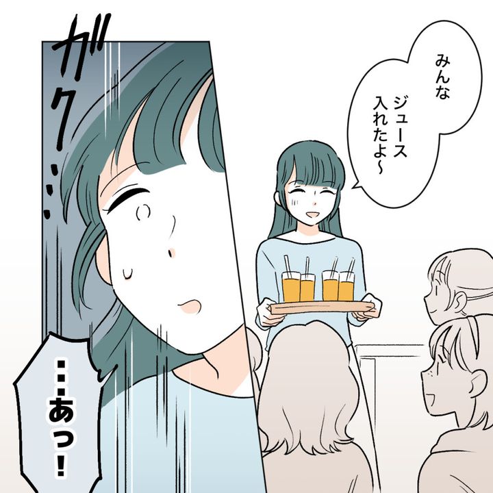 「みんな、ジュース入れたよ~」と子ども達の方へジュースを運んで行ったシズクでしたが、何かにつまずいたのか、「あっ!」という声とともに転びそうになってしまいました。