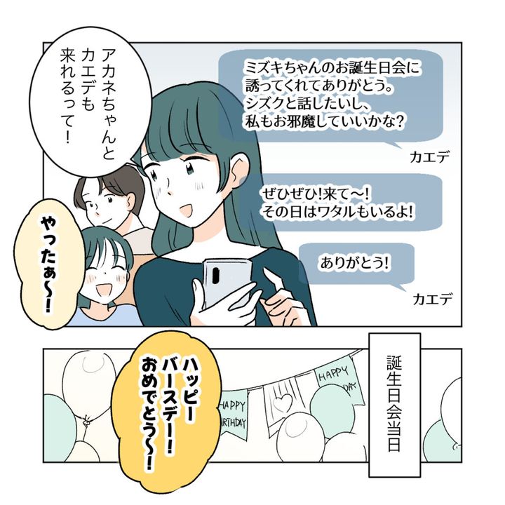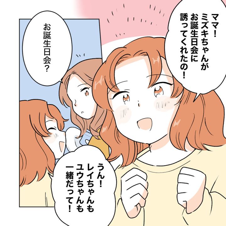 同窓会でシズクが「遊びに来て」と誘ってしばらく経ったある日、アカネが学校から帰るなり「ママ!ミズキちゃんがお誕生日会に誘ってくれたの!」と嬉しそうに報告してきました。他のお友達も参加するらしく、アカネは興奮気味です。