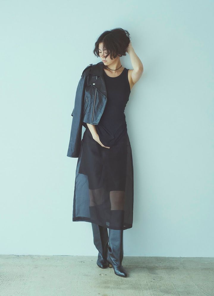 スカート¥60,500、中にはいたバイカーパンツ¥22,000(共にユナス/エストネーション)、タンクトップ¥16,500、ライダース¥198,000(共にオーラリー)、ブーツ¥110,000(ネブローニ)、チョーカー¥231,000、ピアス¥231,000(共にミズキ/リトルリーグ インク)
