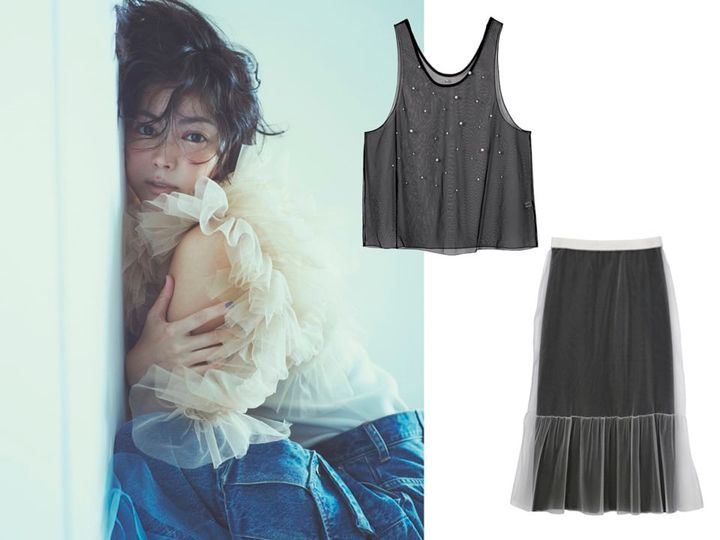 チュールトップス¥53,900、デニムパンツ¥64,900(共にチカ キサダ)、中に着たタンクトップ¥7,700(サロン アダム エ ロペ)