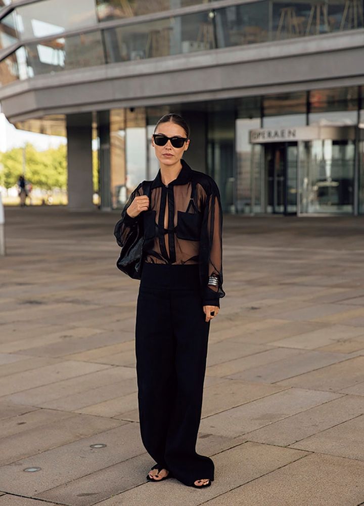 オールブラックの装いに軽やかさとモード感を