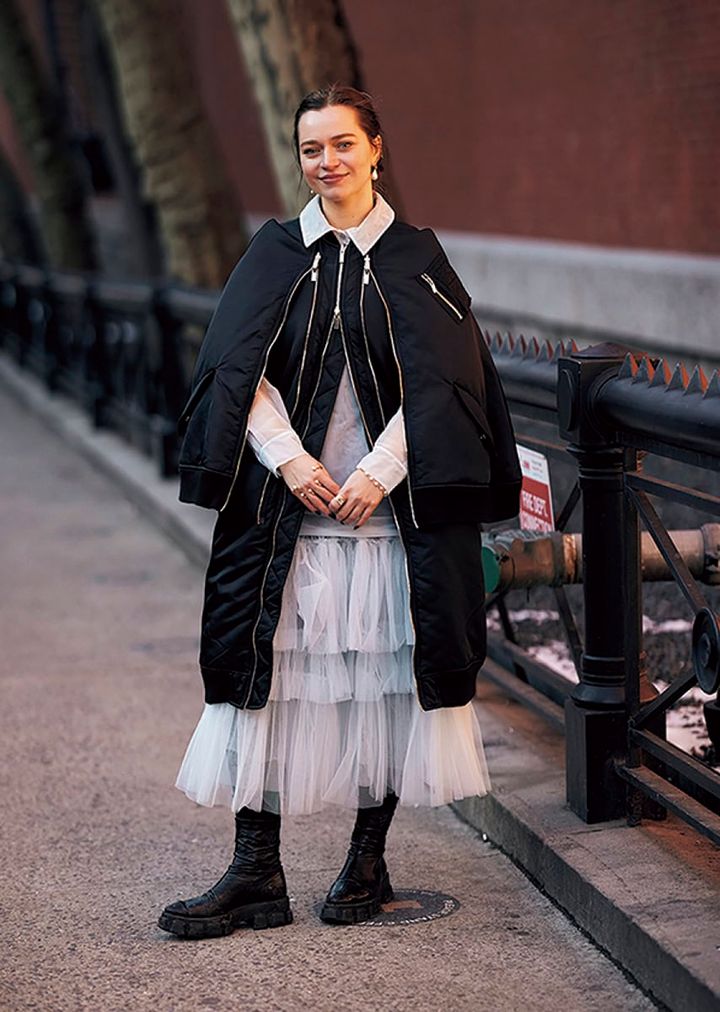 海外スナップでは、ふわっとしてボリューミーだったり、ビーズ刺繍が施された甘めのチュールスカートが優勢。黒ベースの着こなしにあえて投入するのも素敵です。