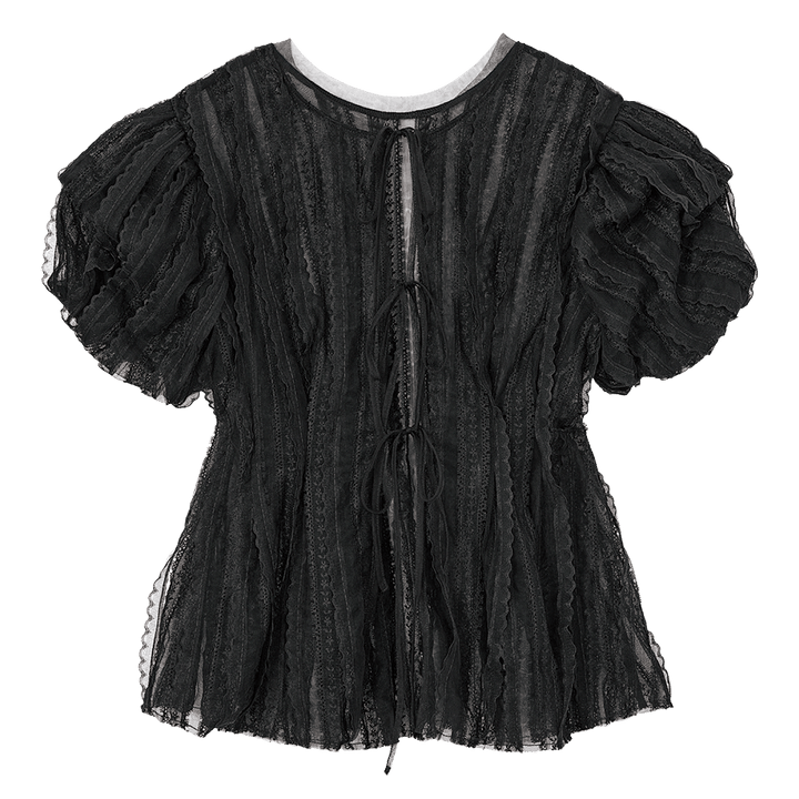 チュール×レーステープでロマンティックな雰囲気を堪能。前後2WAYで着られ、羽織りとしても。