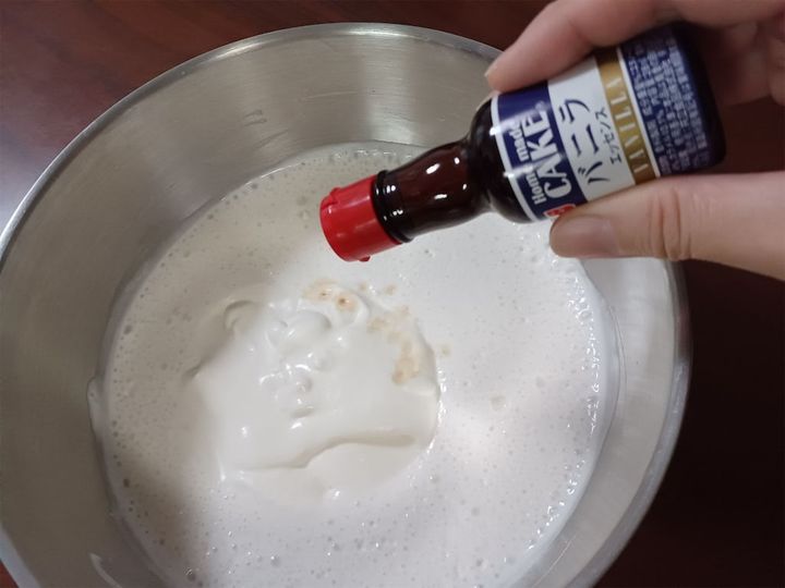 3.2にホイップクリームとバニラエッセンスを加えて均一に混ぜ、バットに入れて冷凍庫へ。