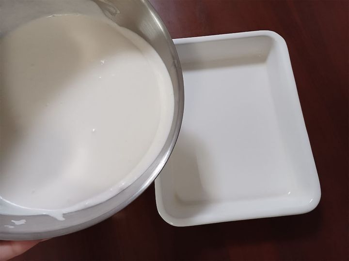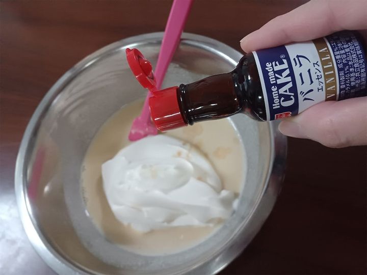 5.4が十分に冷えたらホイップクリームとバニラエッセンスを加えて均一に混ぜ、バットに入れて冷凍庫に入れる。